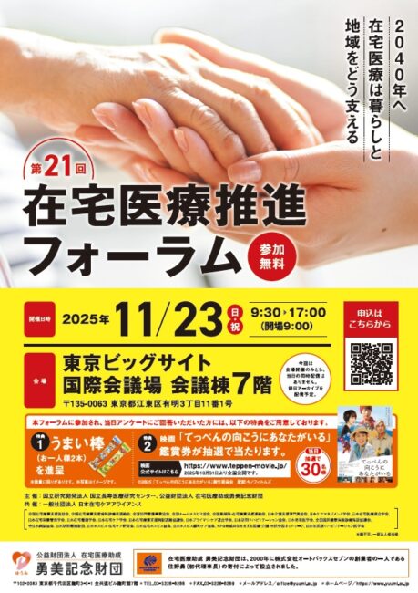 毎年11月23日を「在宅医療の日」とし、 国立長寿医療研究センターと勇美記念財団の主催による「在宅医療推進フォーラム」が開催されます。