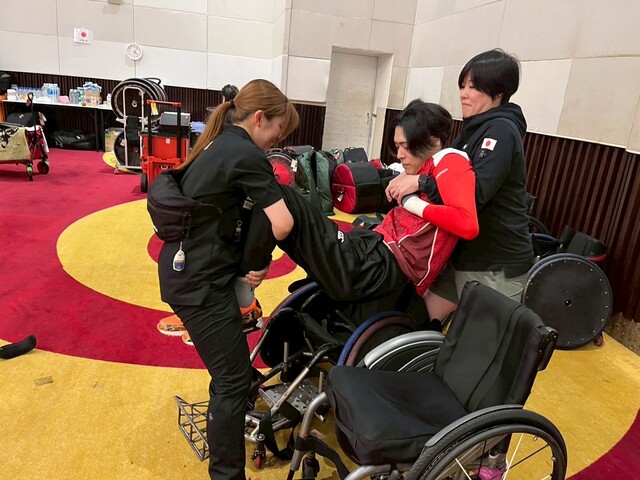 →車いすラグビーは競技車に乗って試合をします。一人で乗り移りができる選手もいますが、出来ない選手もいます。その際にはスタッフが介助します。理学療法士は授業でも介助方法を学ぶのでパラスポーツには理学療法士が必要になります。
