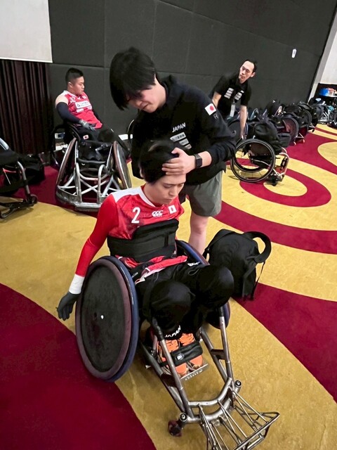 →車いすラグビーはタックルが激しいので、毎日交通事故にあっているかのような衝撃を受けます。その為、頸部に痛みが出る選手も少なくありません。そのため試合前の短い時間でもコンディショニングを整えていきます。