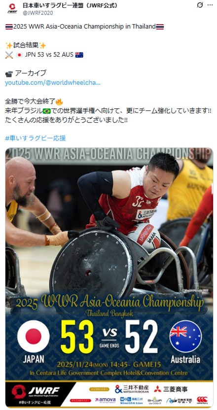 先日までタイで開催されていた「車いすラグビーアジア・オセアニア大会」では、日本代表チームが見事に全勝優勝を飾りました!